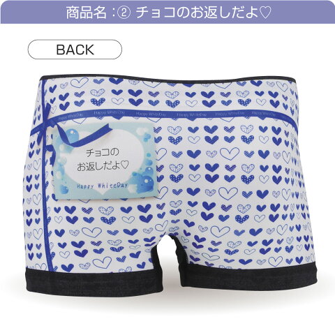 バレンタインチョコの お返しにホワイトデーデザインのボクサーパンツはプレゼントにピッタリ! バックプリント部分のカードメッセージが選べます。